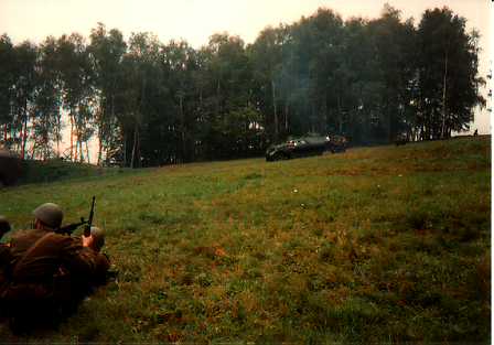 Na kopci už je vidět německý obrněný transportér, který kryje za ním postupující jednotky.